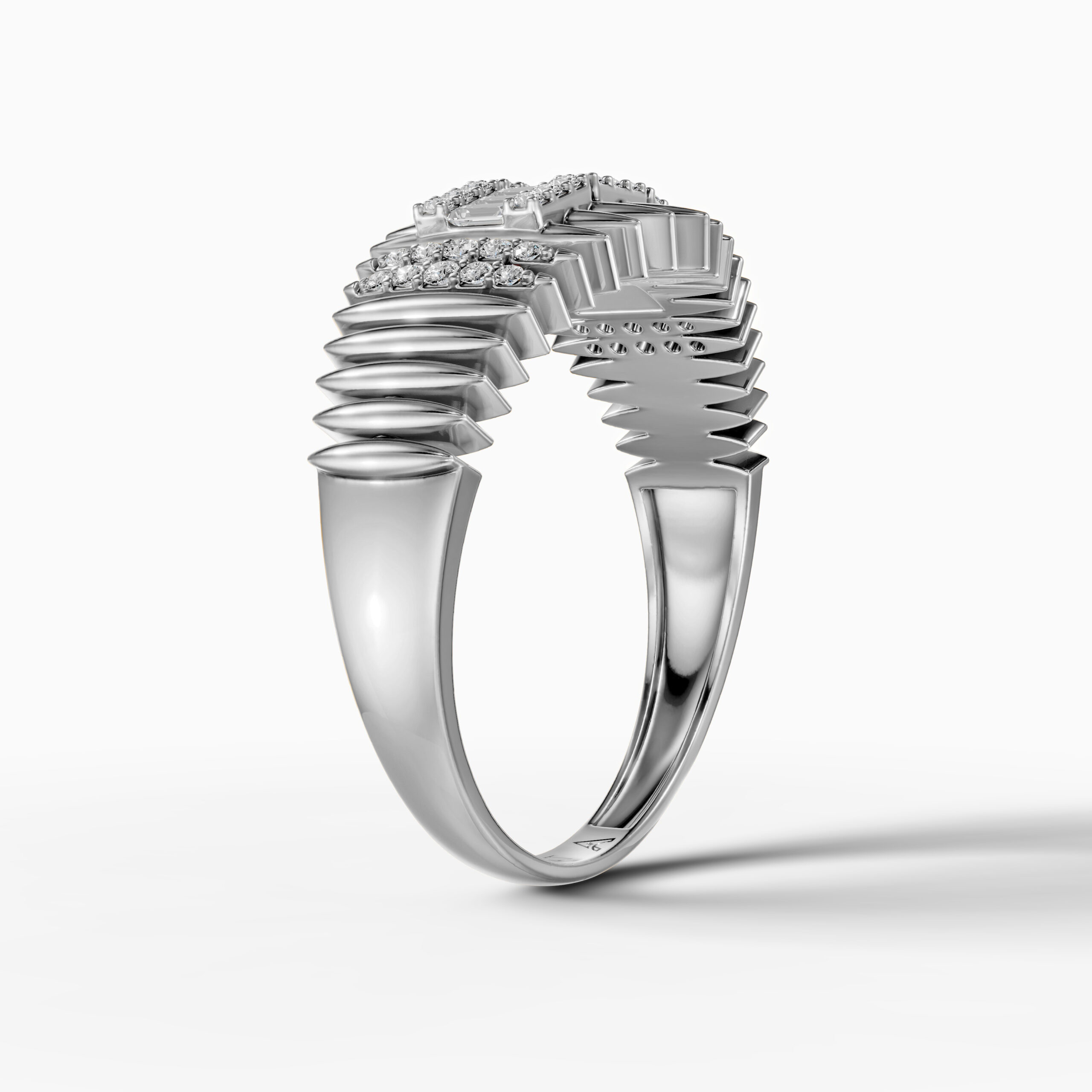 Crafted in 14K yellow gold, this striking ring blends modern geometry with timeless sparkle. A row of baguette-cut diamonds framed by round pavé accents creates a structured centerpiece, while the ridged gold band adds bold texture. A statement piece with natural brilliance — perfect for collectors of fine gold and diamond jewelry.