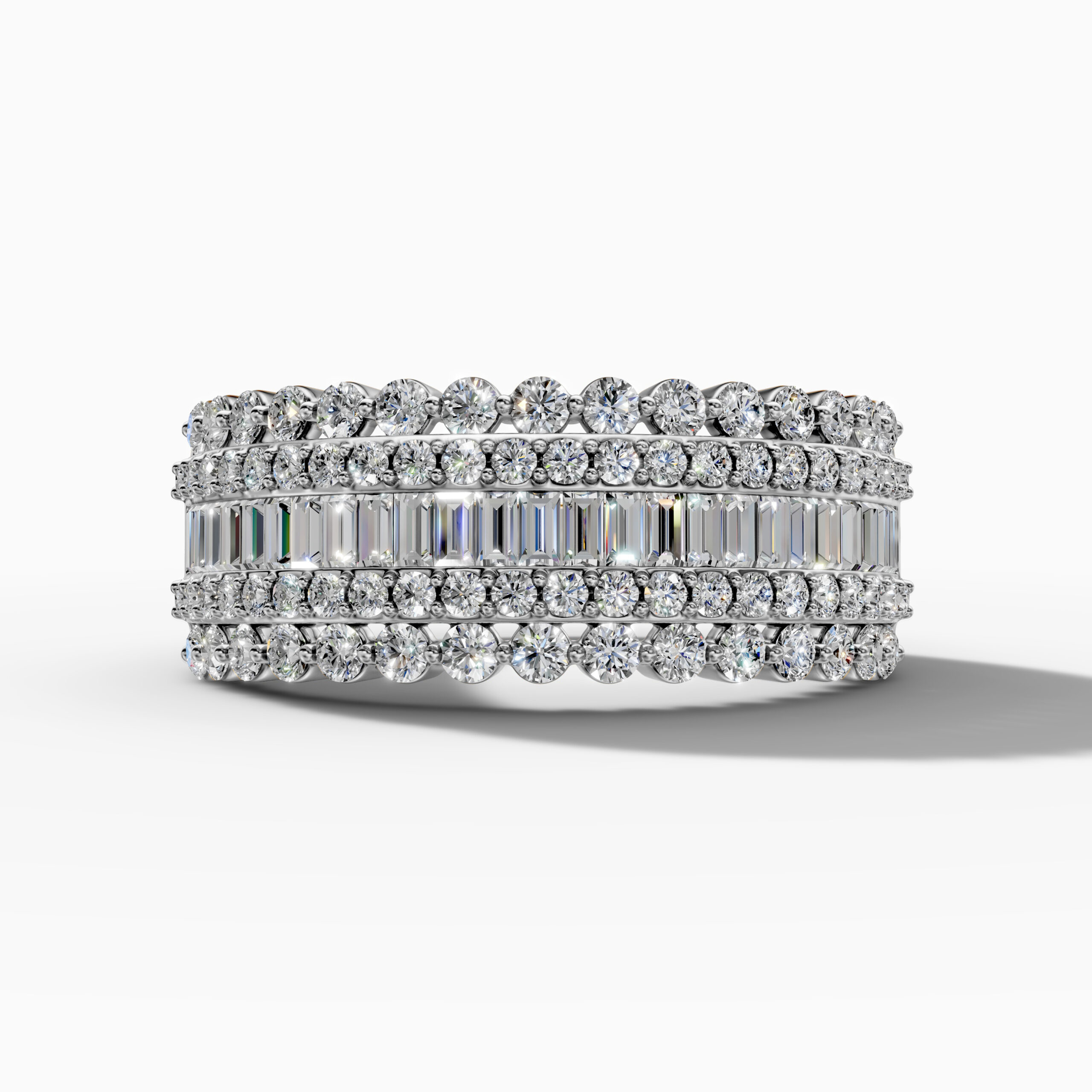 Crafted in 14K white gold, this ring dazzles with rows of baguette and round-cut natural diamonds for a bold, timeless sparkle. Perfect for stacking or wearing solo, it’s the ultimate statement of elegance. Whether as an anniversary gift, a milestone celebration, or a glamorous accessory for evening events, this ring embodies luxury and meaning in every detail.