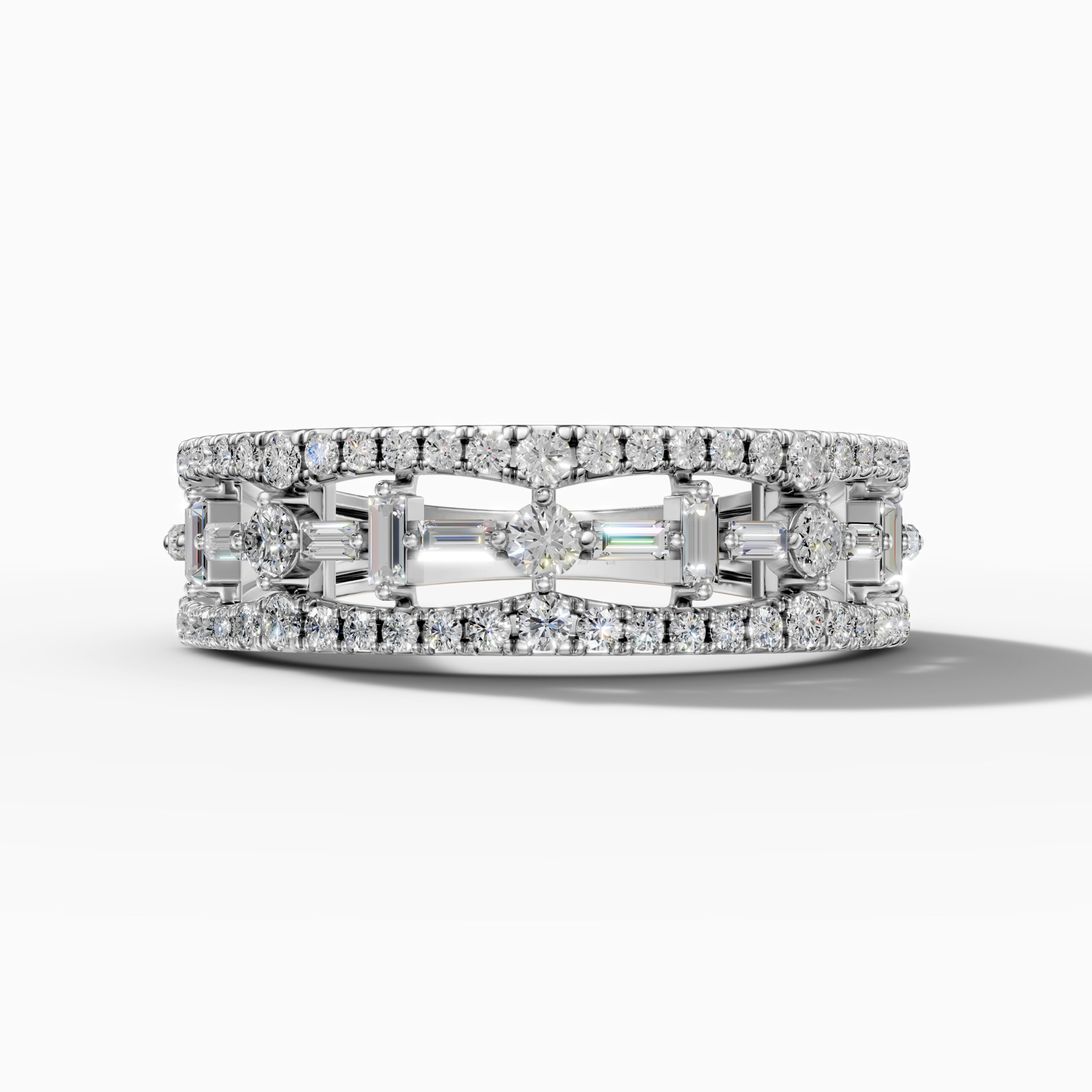Modern artistry meets timeless brilliance in this 14K gold geometric diamond band. Featuring alternating baguette and round-cut natural diamonds, framed by pavé-set borders, the design creates a bold architectural silhouette with maximum sparkle. A striking statement piece crafted to stand out in any fine jewelry collection.