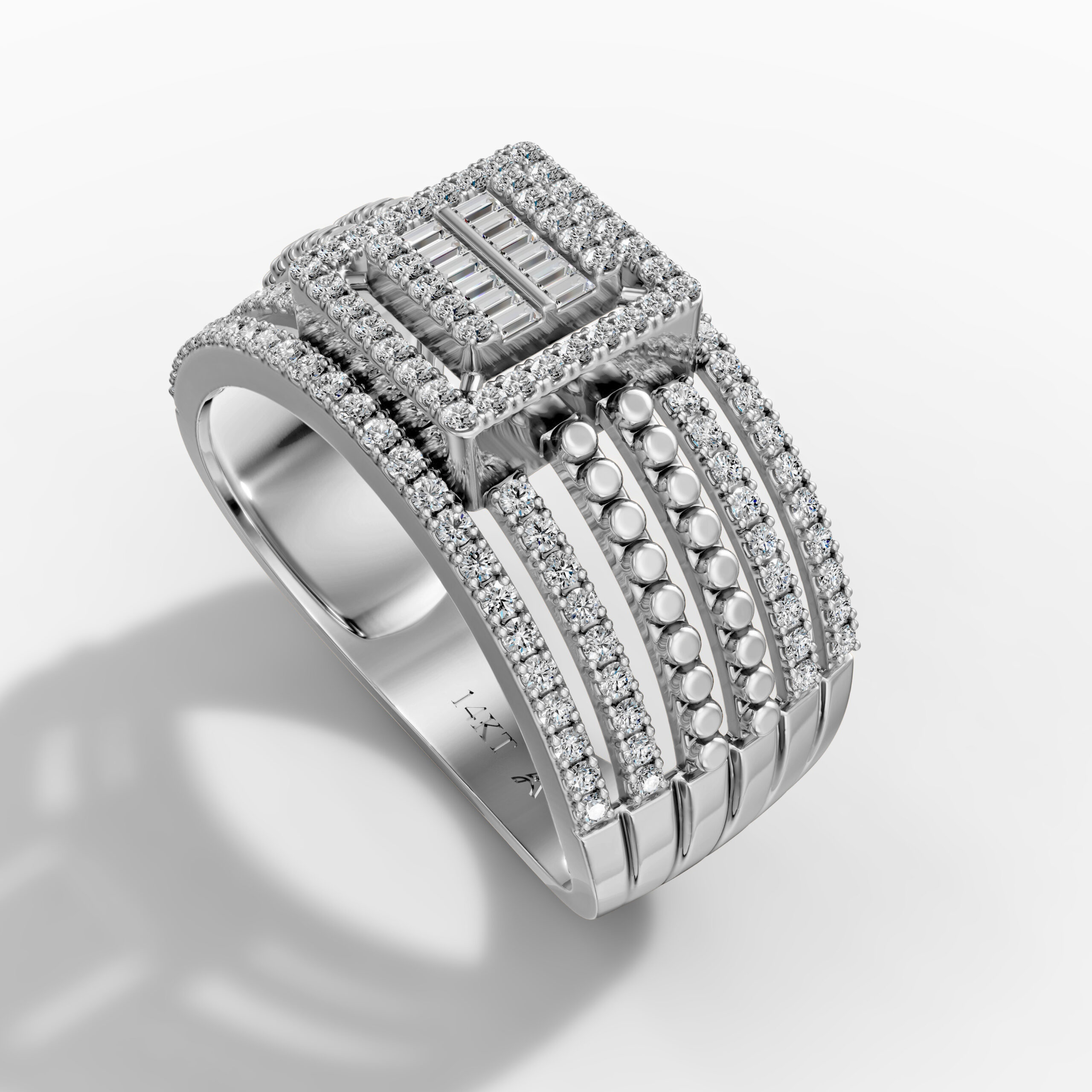 Modern architecture meets timeless luxury. This Aminov Jewelry 14K white gold band showcases a striking geometric motif framed with pavé-set round diamonds and accented by baguette-cut natural diamonds at the center. The structured gold detailing adds depth and texture, making this ring a true statement of sophistication and design. Perfect for those who appreciate artistry and precision in every facet.