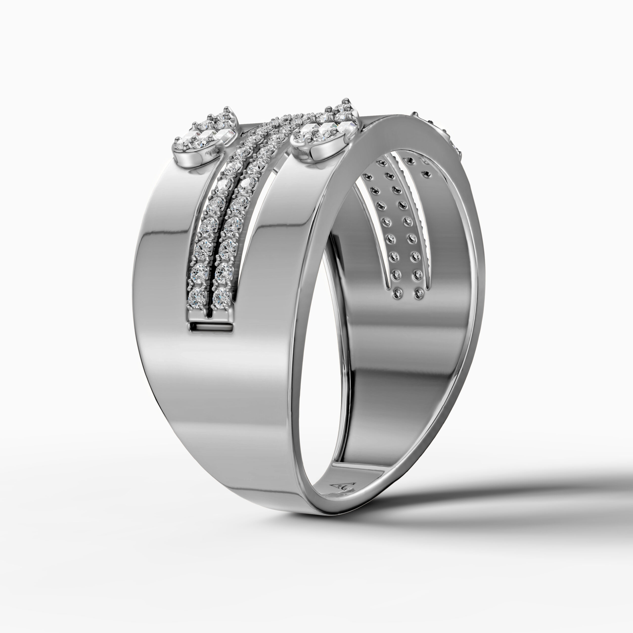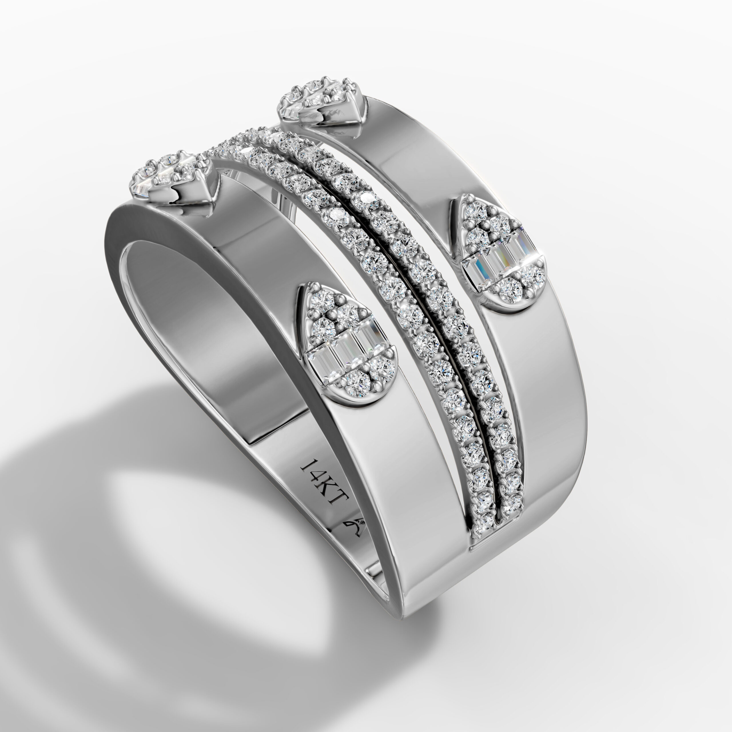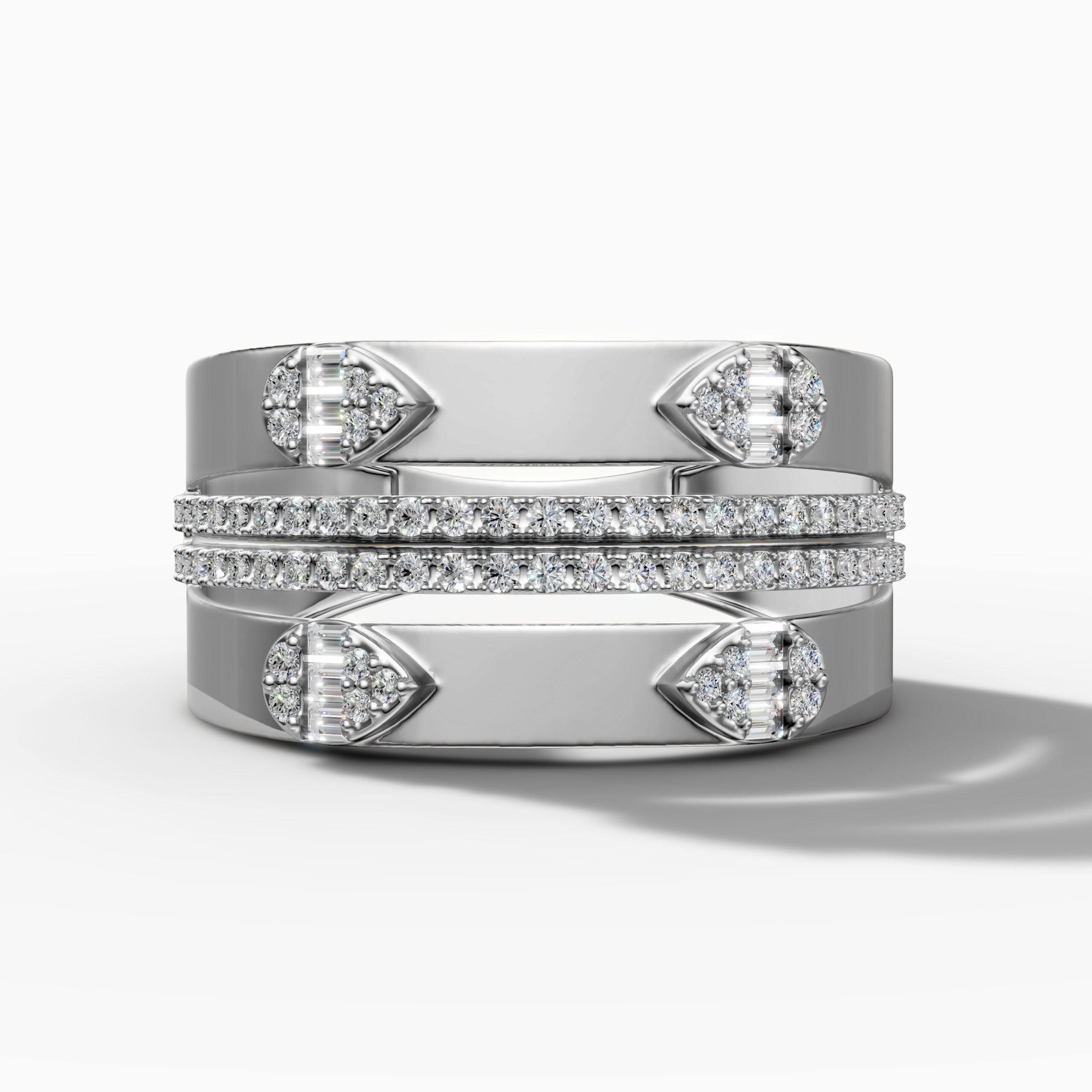 Crafted in 14K white gold, it features a wide band accented by two pavé diamond rows and distinctive baguette diamond clusters that appear to float within the gold structure.