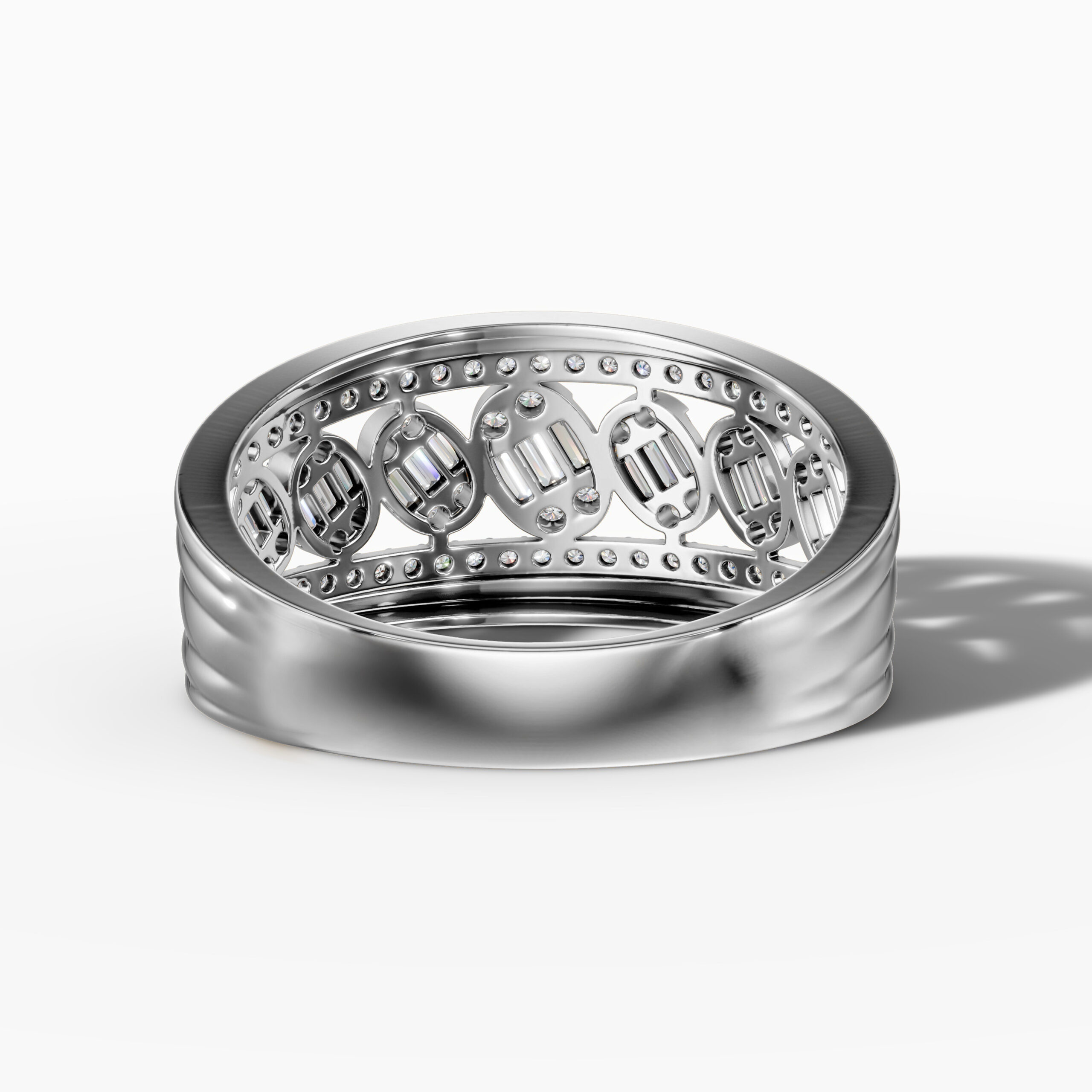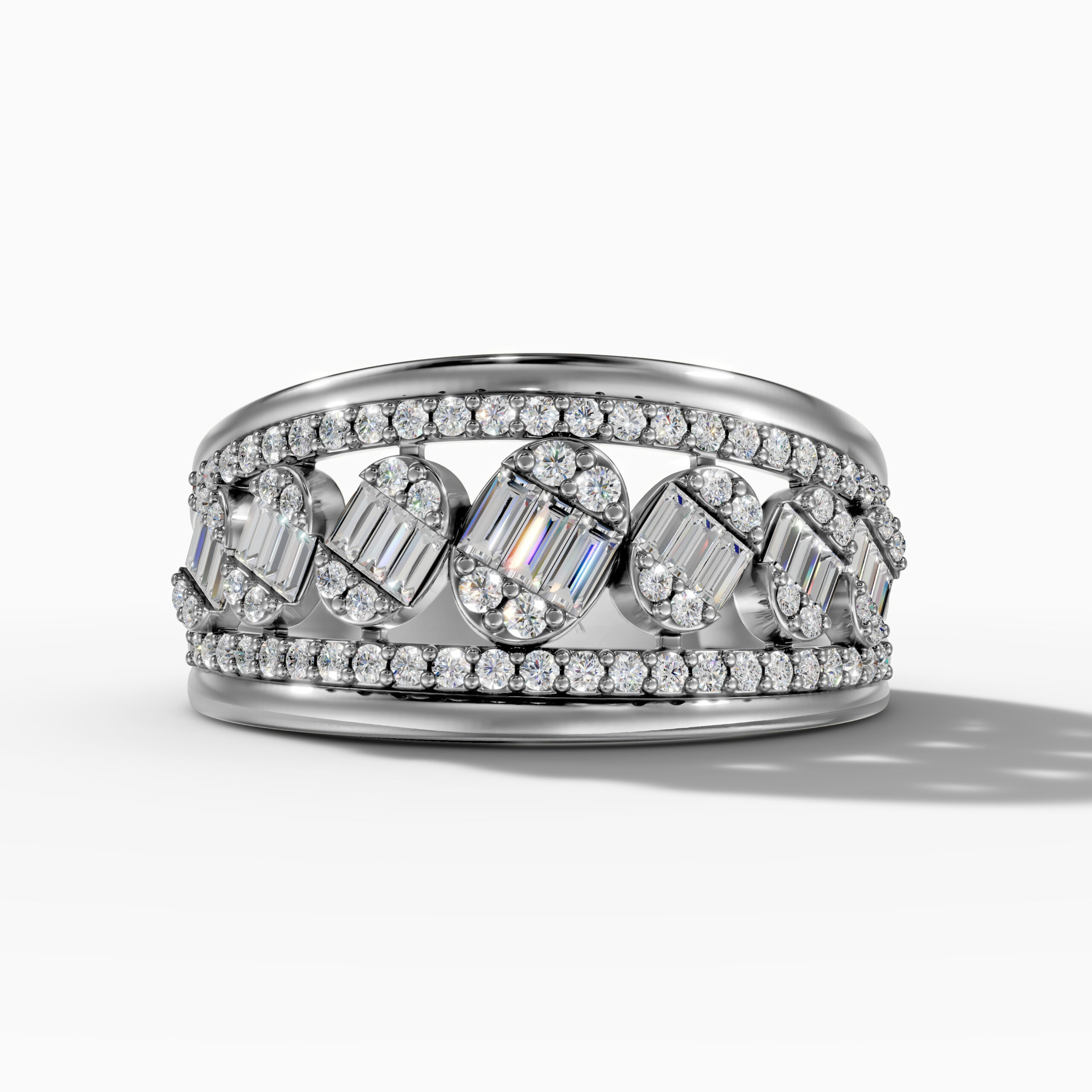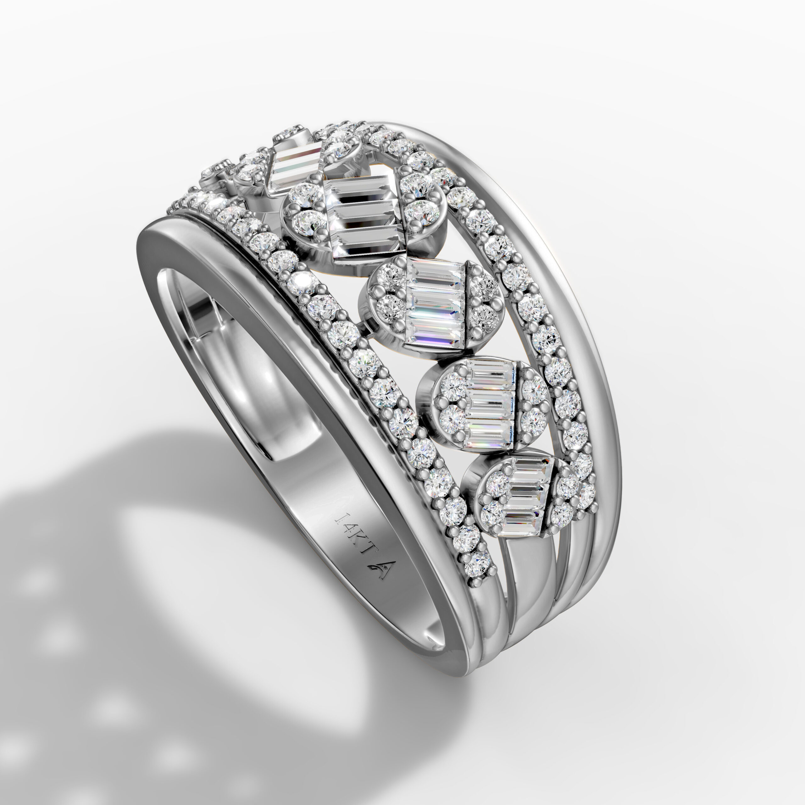 A modern classic with architectural charm — this Aminov Jewelry ring is a study in light and balance. Crafted in 14K white gold, it features alternating baguette and round-cut natural diamonds, each set within open geometric frames that enhance brilliance and depth.