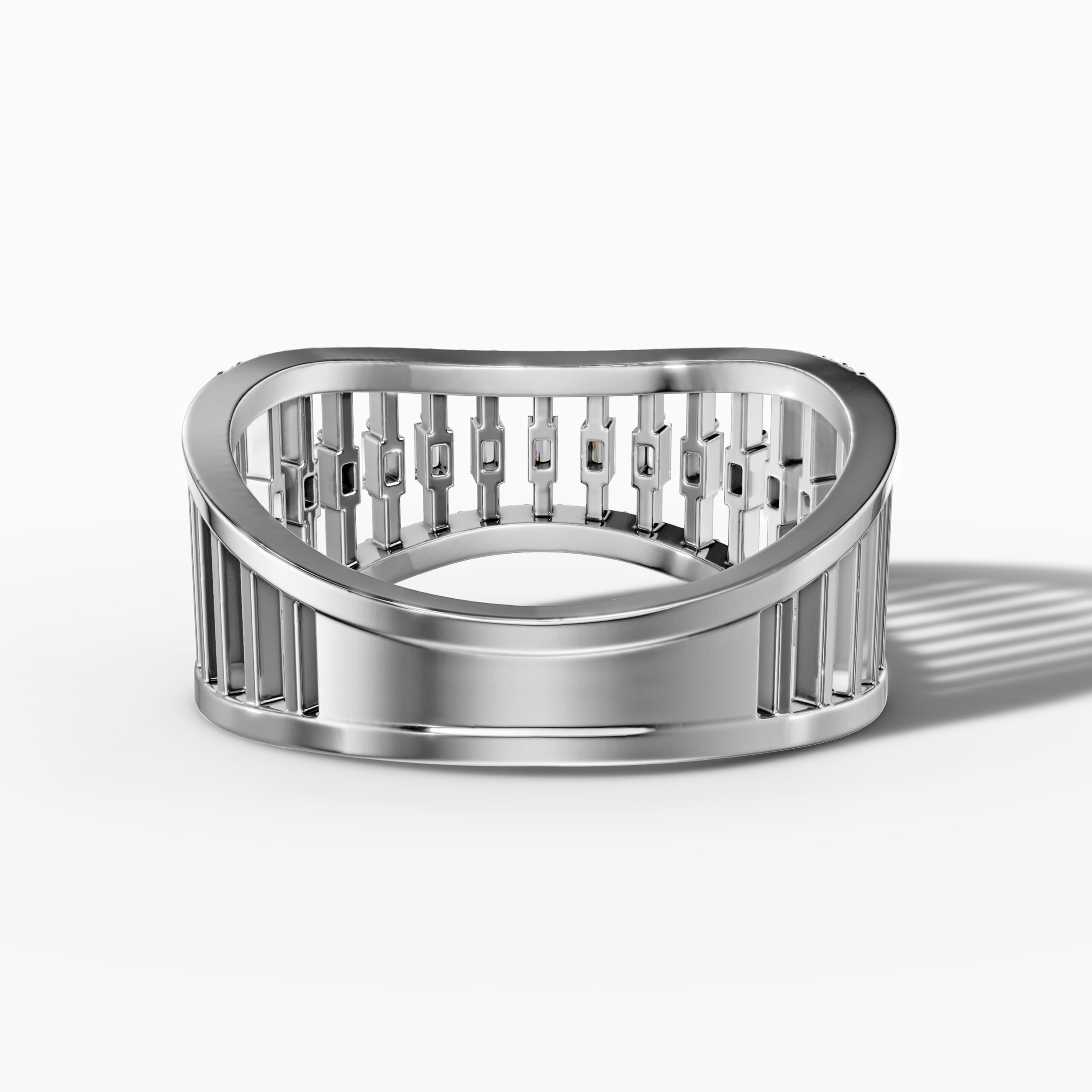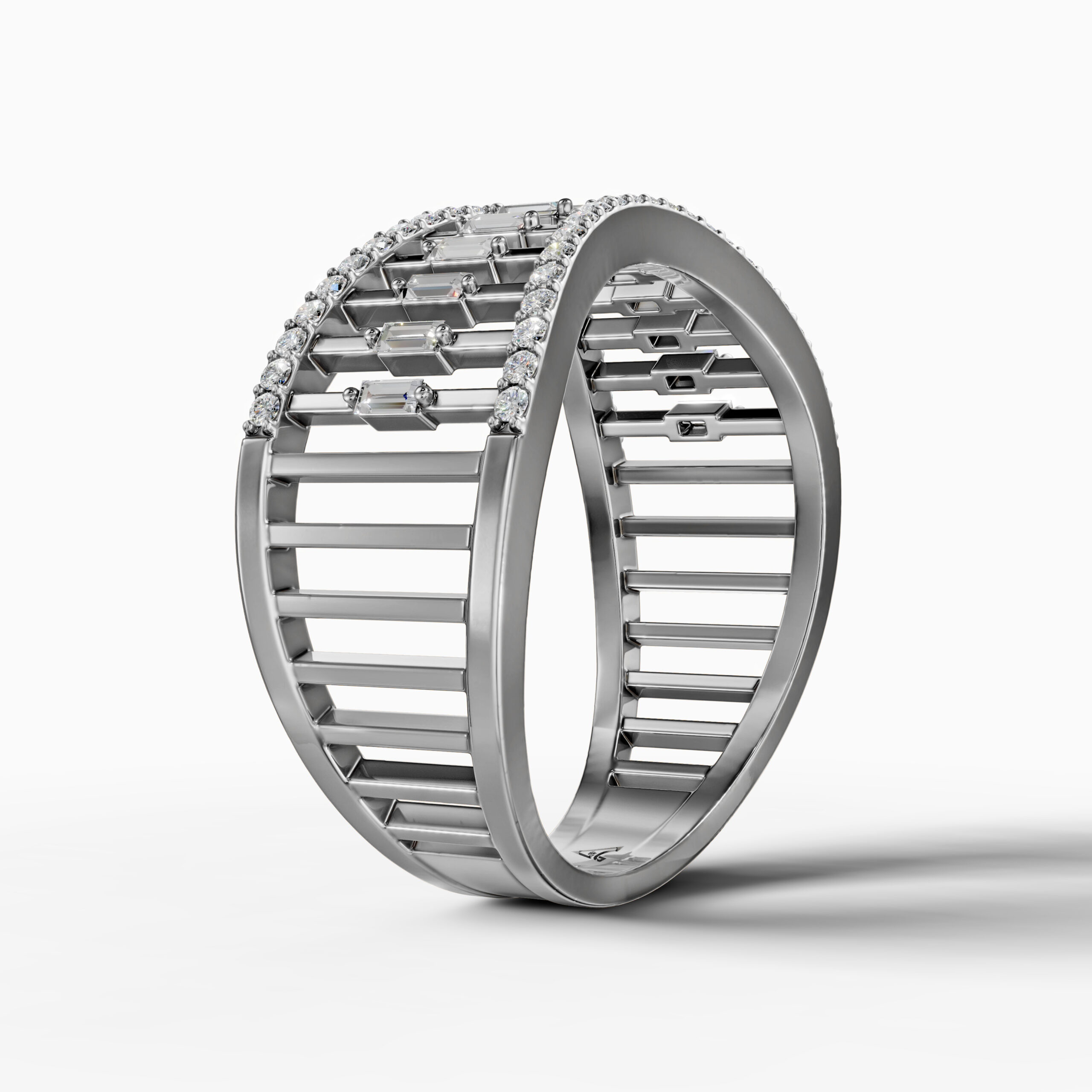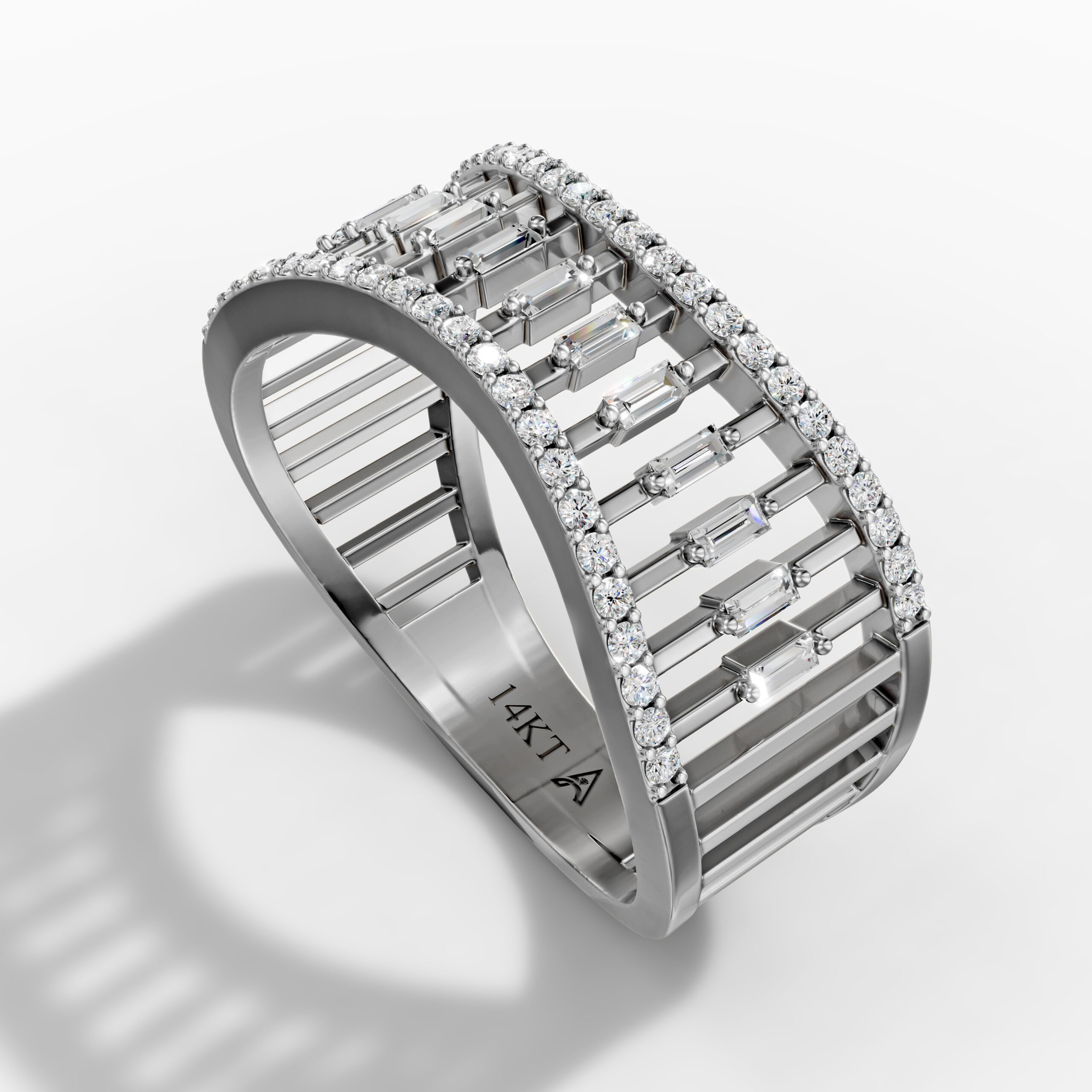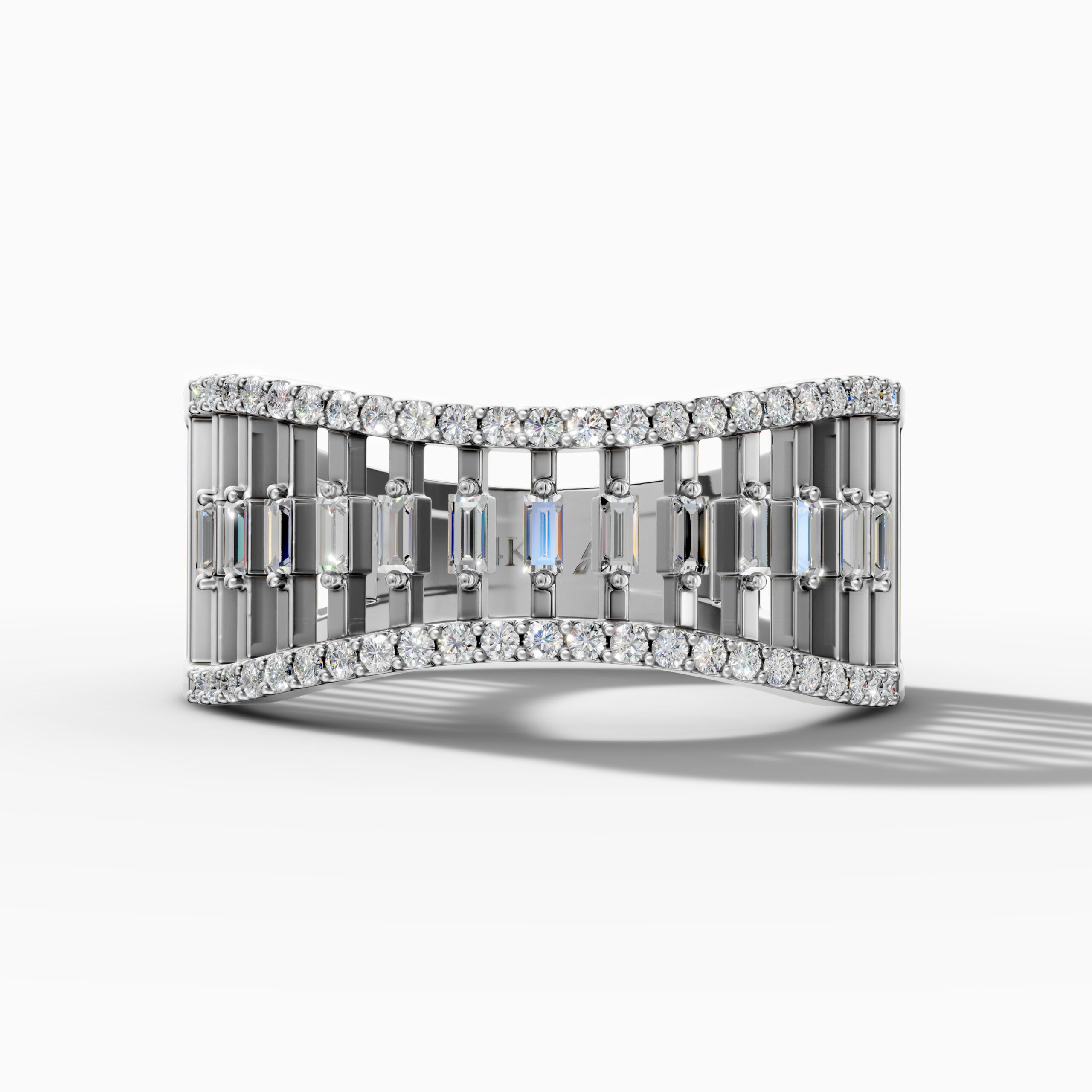 A vision of symmetry and light — this Aminov Jewelry creation redefines contemporary sophistication. Crafted in 14K white gold, the band features a sculptural open design accented with rows of baguette and round-cut natural diamonds.