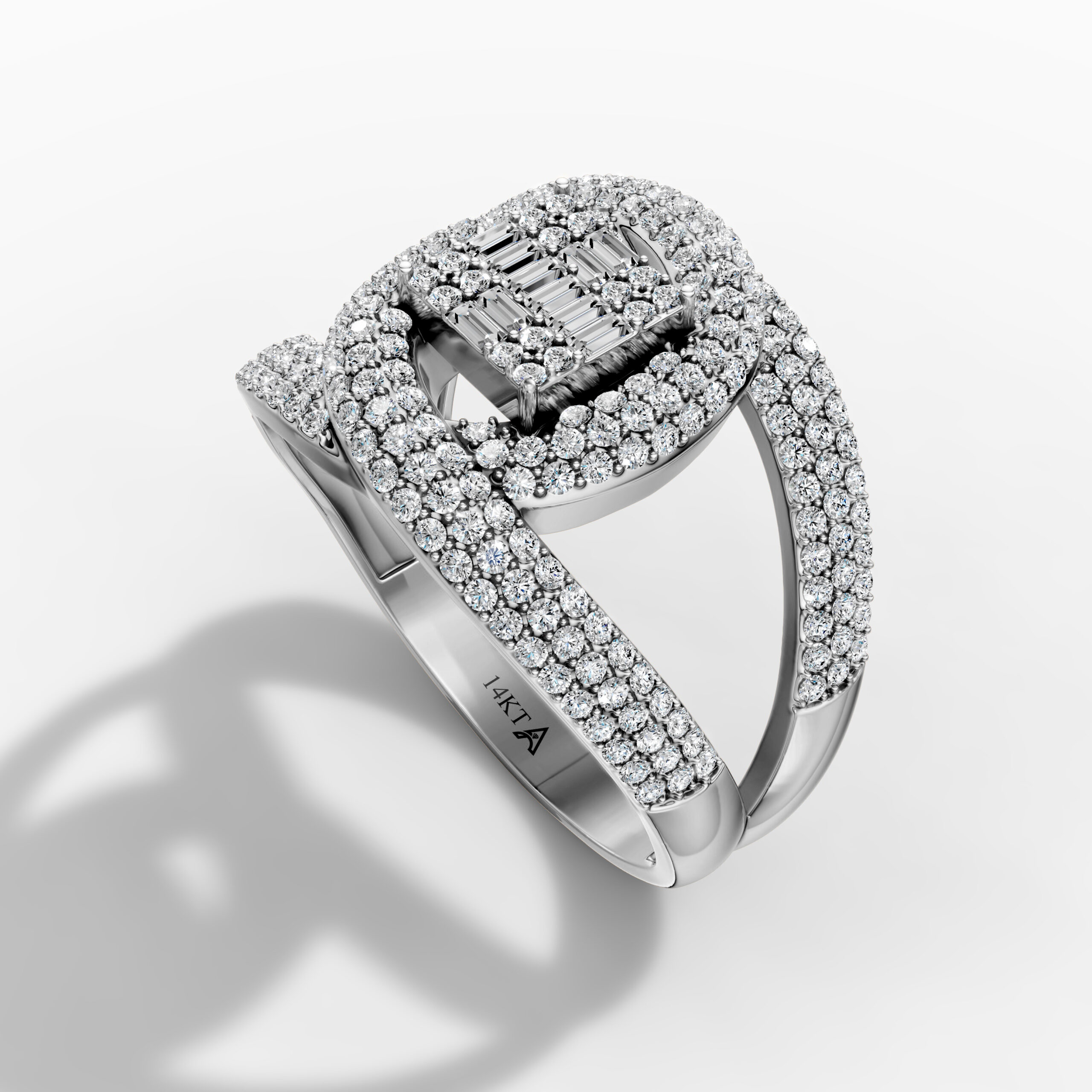 This striking Aminov Jewelry ring is crafted in 14K white gold and features a bold geometric center framed by intricate pavé-set natural diamonds. Baguette and round-cut stones combine to form a radiant grid that captures light from every angle.