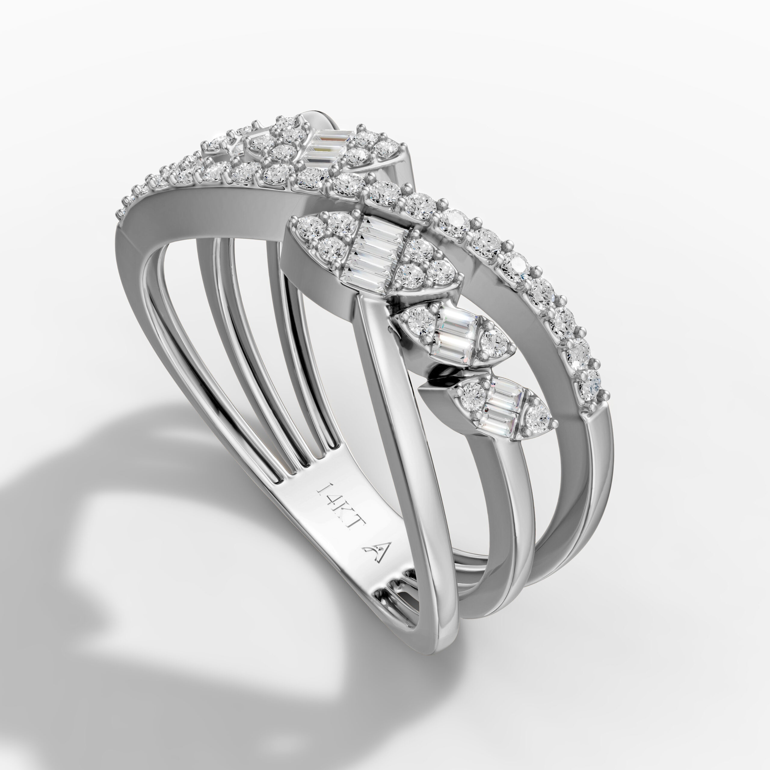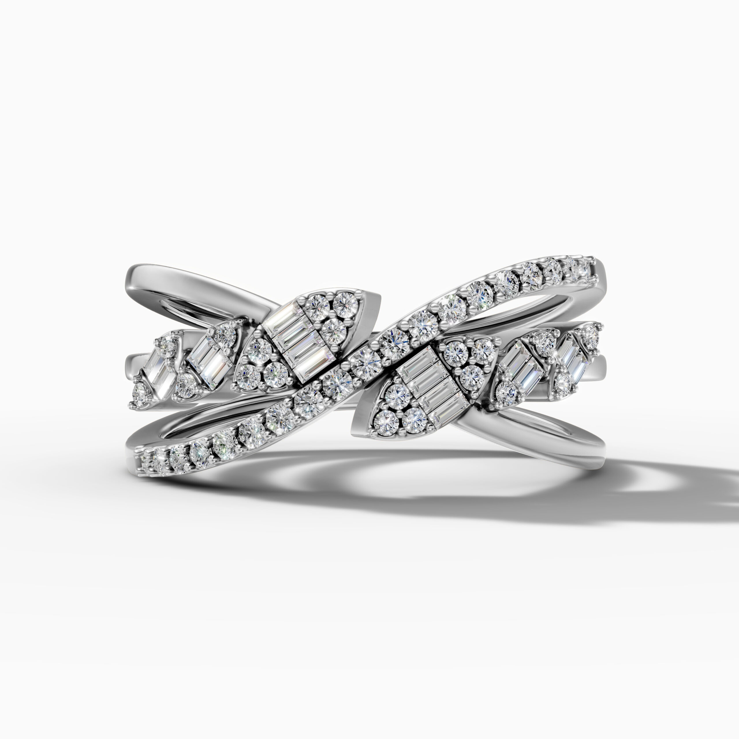 This 14K white gold Aminov Jewelry ring showcases intertwining curves set with baguette and round-cut natural diamonds that form a graceful leaf-like pattern. The twisted band adds fluid movement, while the combination of diamond shapes creates captivating depth and brilliance.