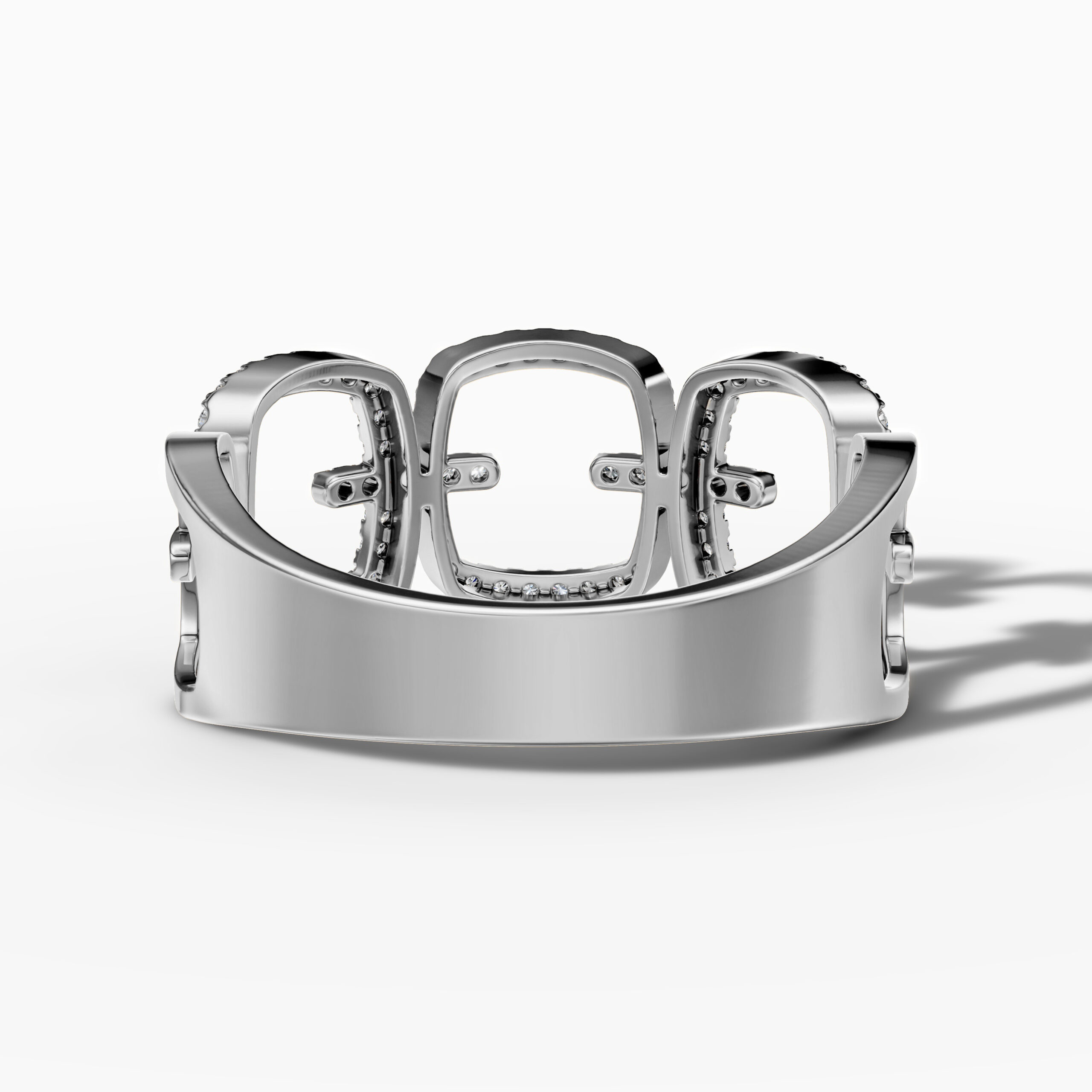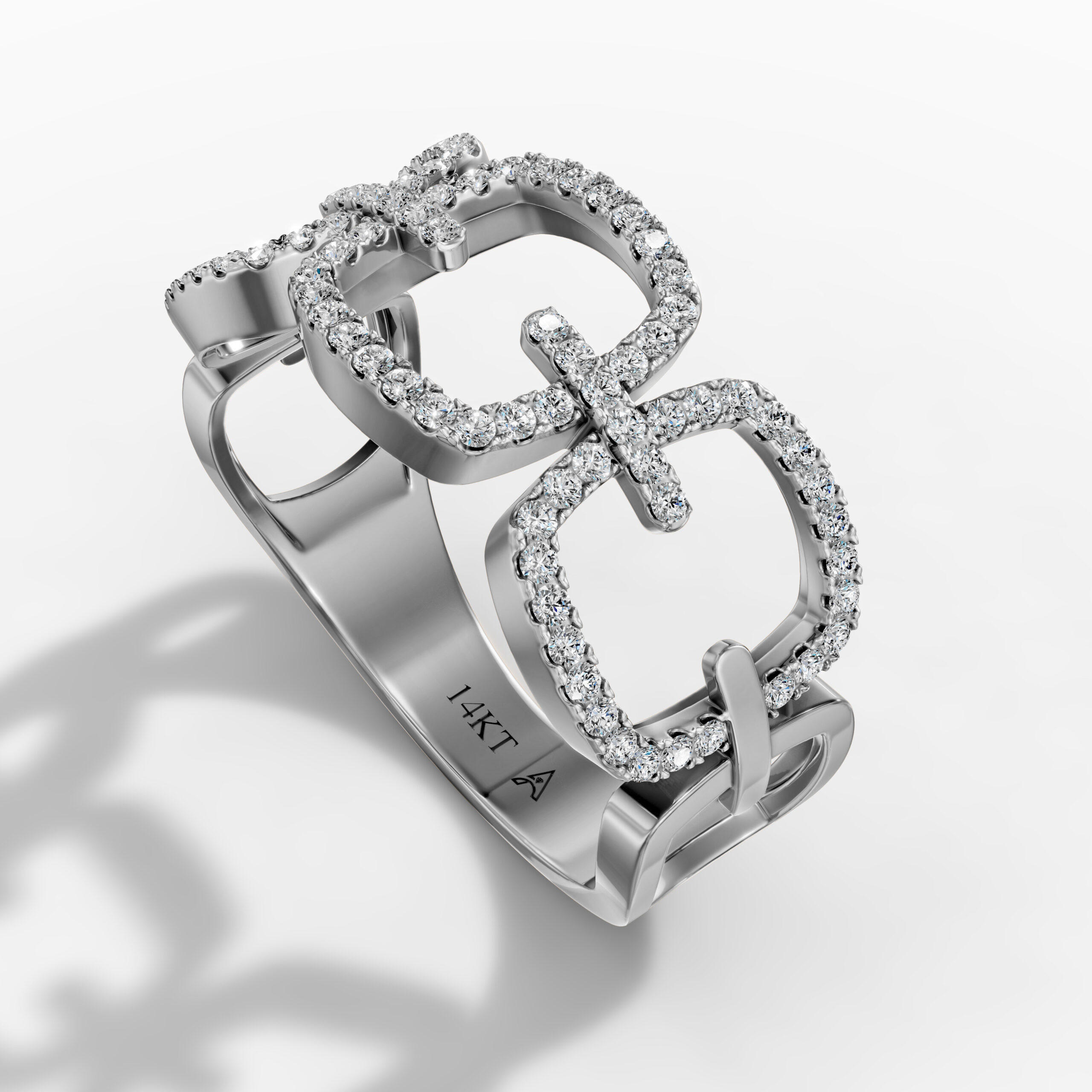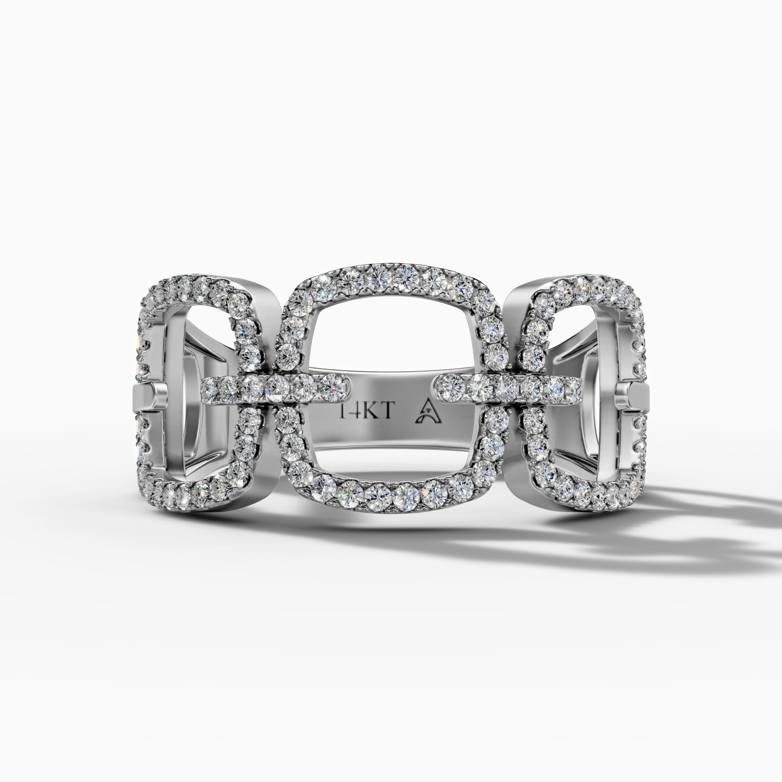 Modern, elegant, and endlessly versatile. Crafted in 14K White gold, this link-style ring features interlocking diamond-set shapes that create a refined chain-inspired silhouette. Each link is meticulously pavé-set with round-cut natural diamonds, adding a luxurious sparkle to its sculptural design.