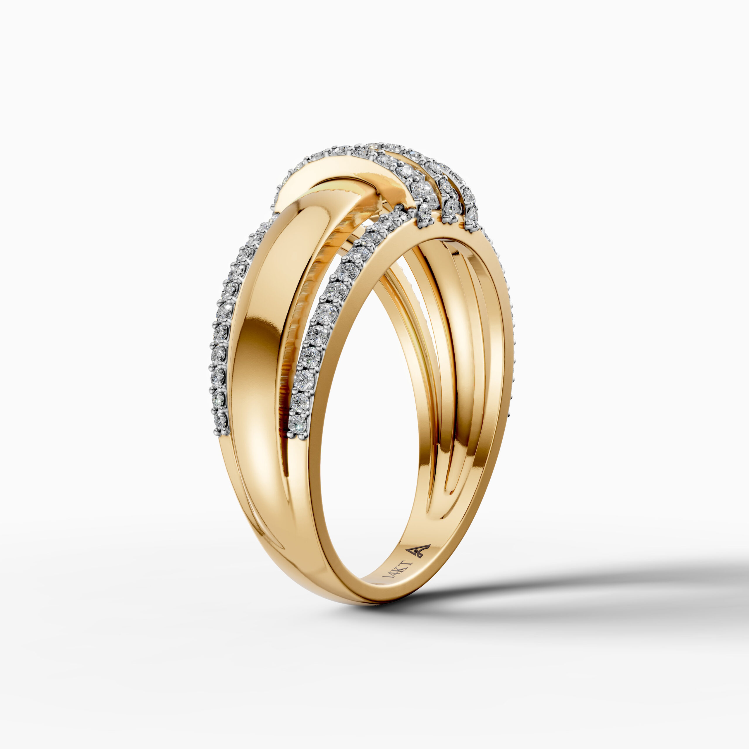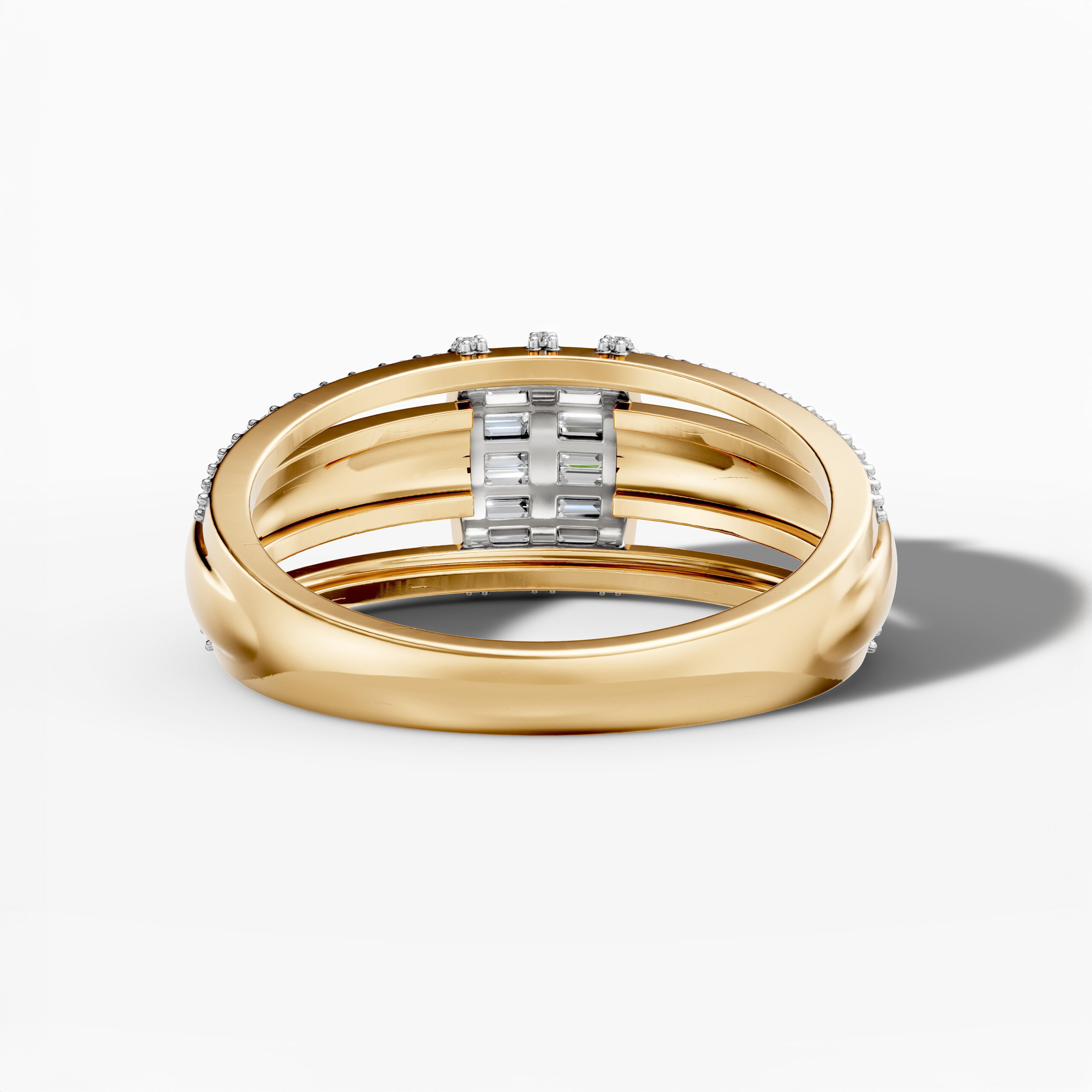 Looking for a ring that makes an impression from every angle? This yellow 14K gold band from Aminov Jewelry combines sleek polish with captivating sparkle. Three rows of baguette and round-cut natural diamonds create a sculptural center that catches the light with every movement.