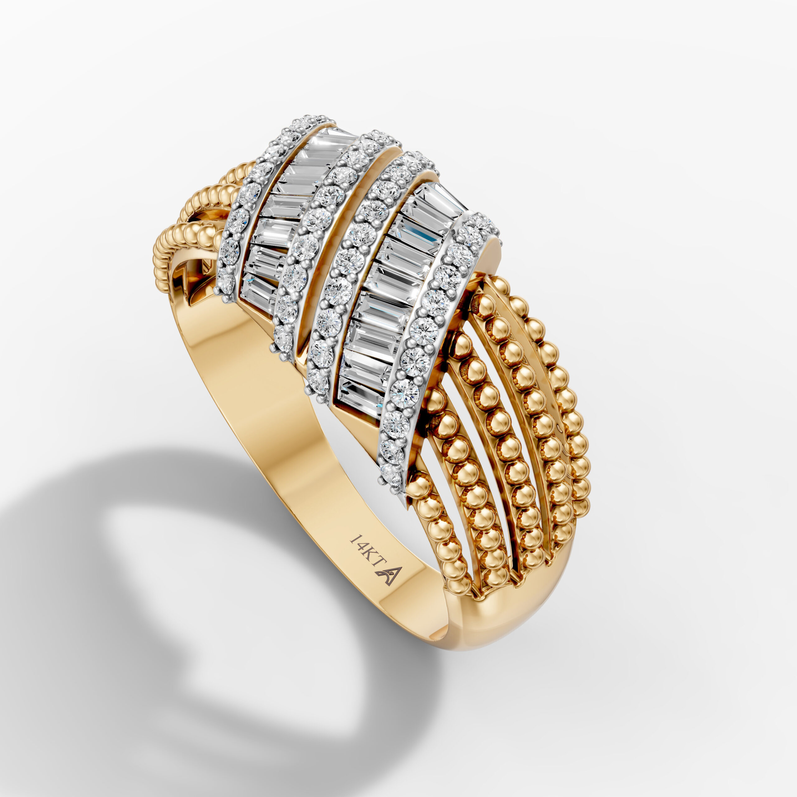 A modern classic with a touch of boldness. Crafted in 14K yellow gold, this bujukan ring features alternating strands of beaded gold and pavé diamond bands crossing in perfect symmetry. Baguette and round-cut natural diamonds create a radiant play of light that catches every glance.