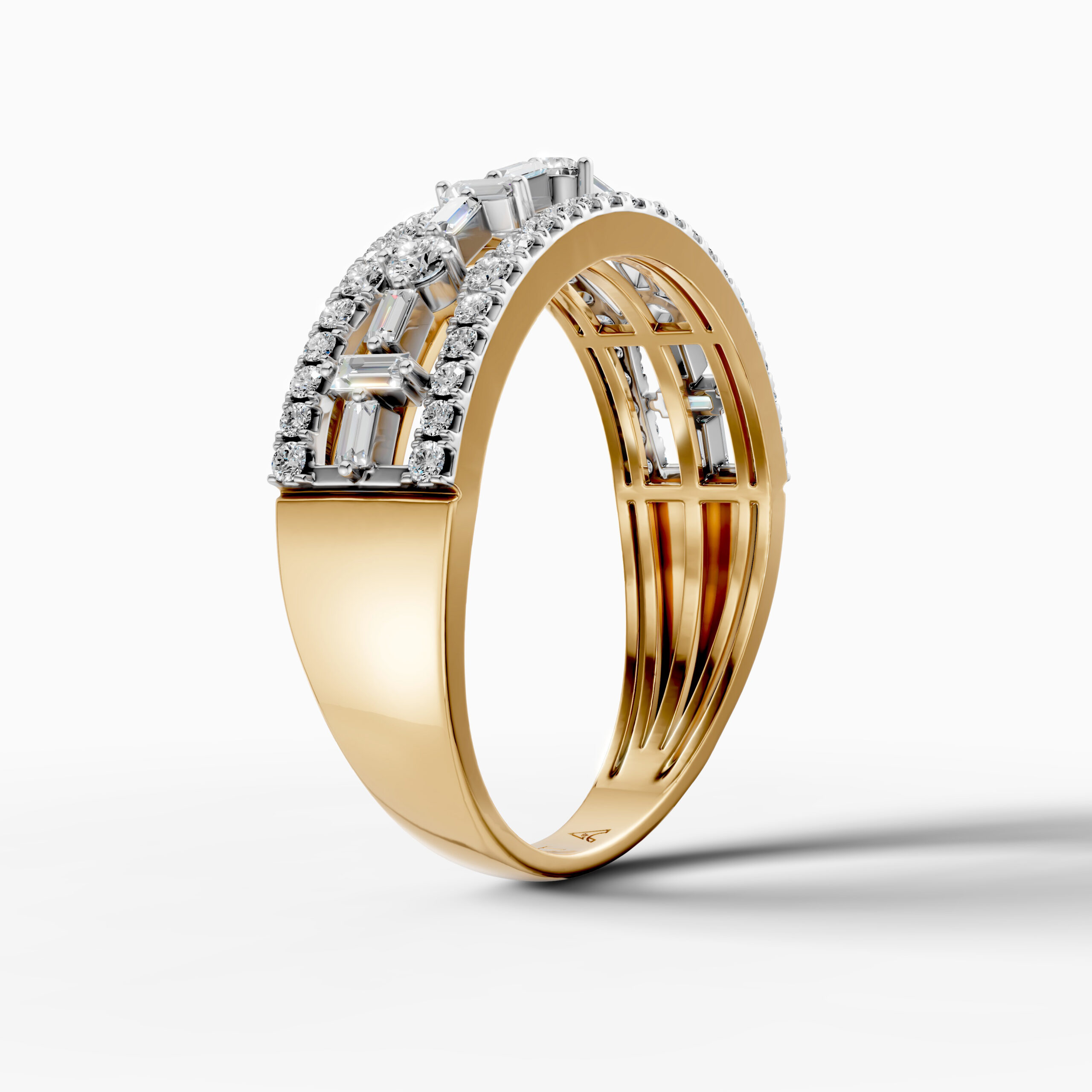 Modern artistry meets timeless brilliance in this 14K gold geometric diamond band. Featuring alternating baguette and round-cut natural diamonds, framed by pavé-set borders, the design creates a bold architectural silhouette with maximum sparkle. A striking statement piece crafted to stand out in any fine jewelry collection.