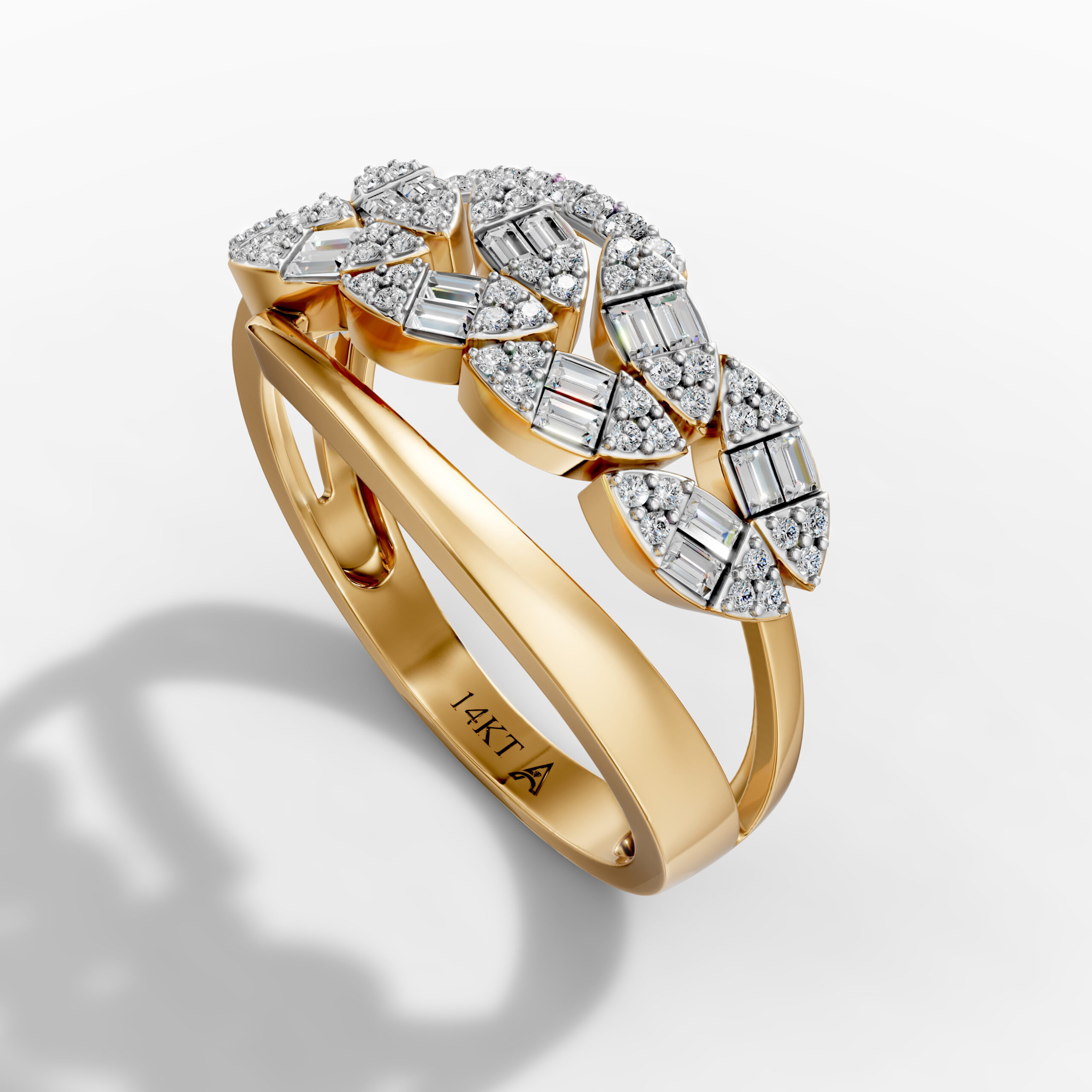 Looking for a diamond ring that feels both organic and luxurious? This 14K yellow gold design from Aminov Jewelry captures the graceful beauty of nature with marquise-shaped leaves paved in baguette and round-cut natural diamonds. The split-shank silhouette adds modern balance to the fluid, leaf-inspired pattern.