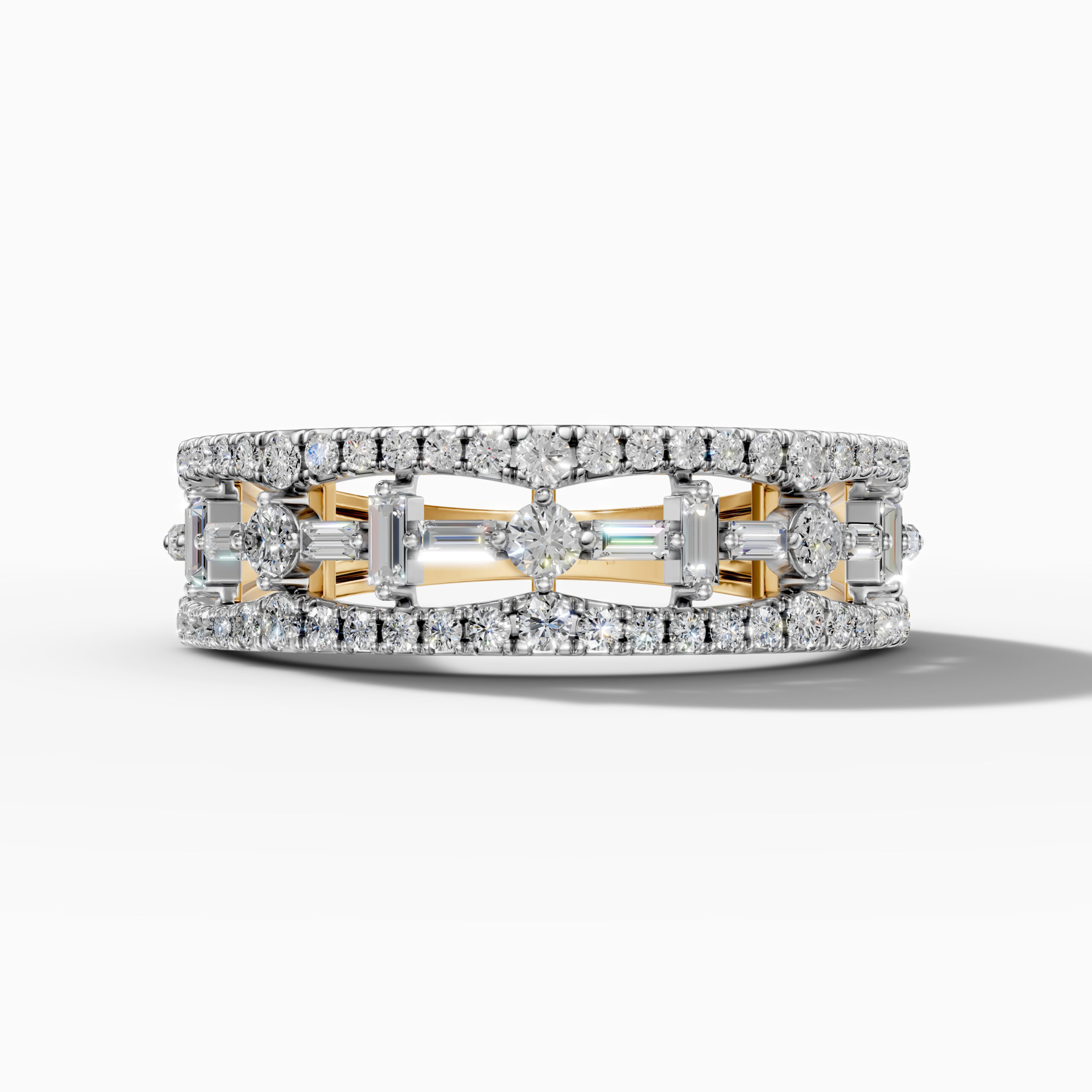 Refined geometry meets timeless brilliance. This Aminov Jewelry 14K yellow gold band features alternating baguette and round natural diamonds arranged in a distinctive architectural pattern. Framed by pavé-set diamonds along the edges, the open design creates depth and dimension, while the mix of cuts captures light from every angle. A bold yet balanced statement that defines modern luxury.