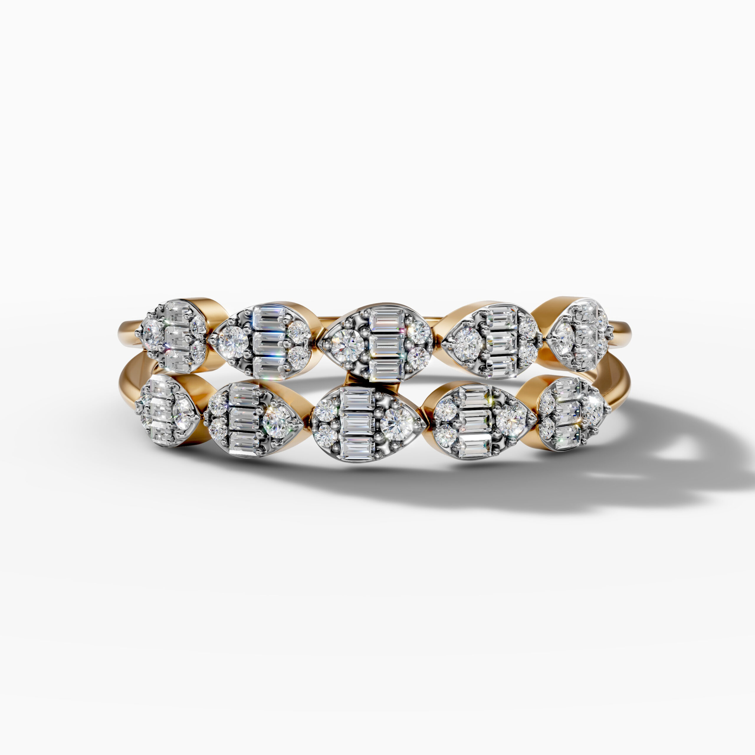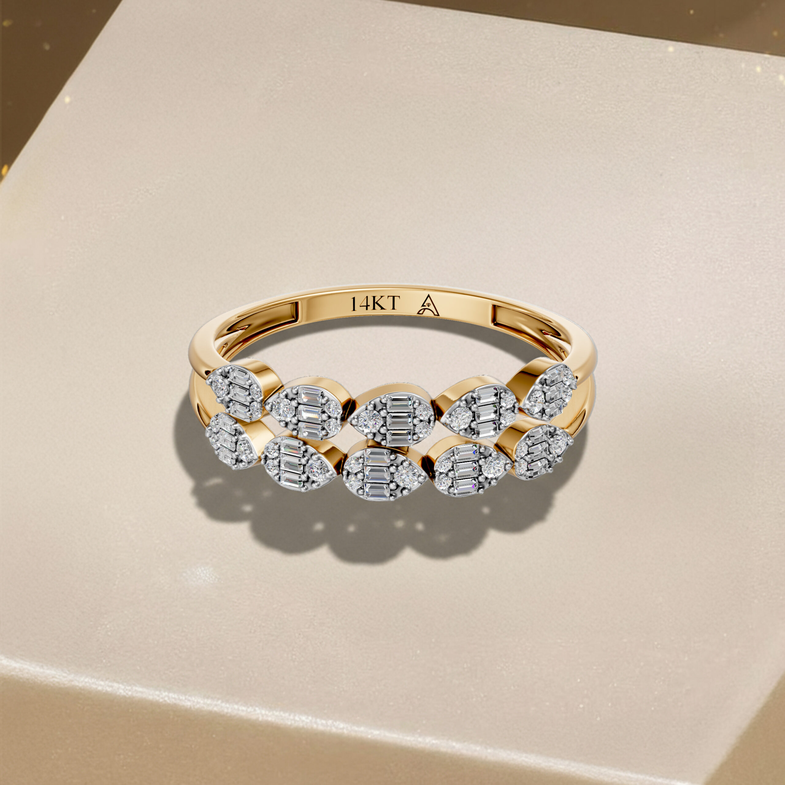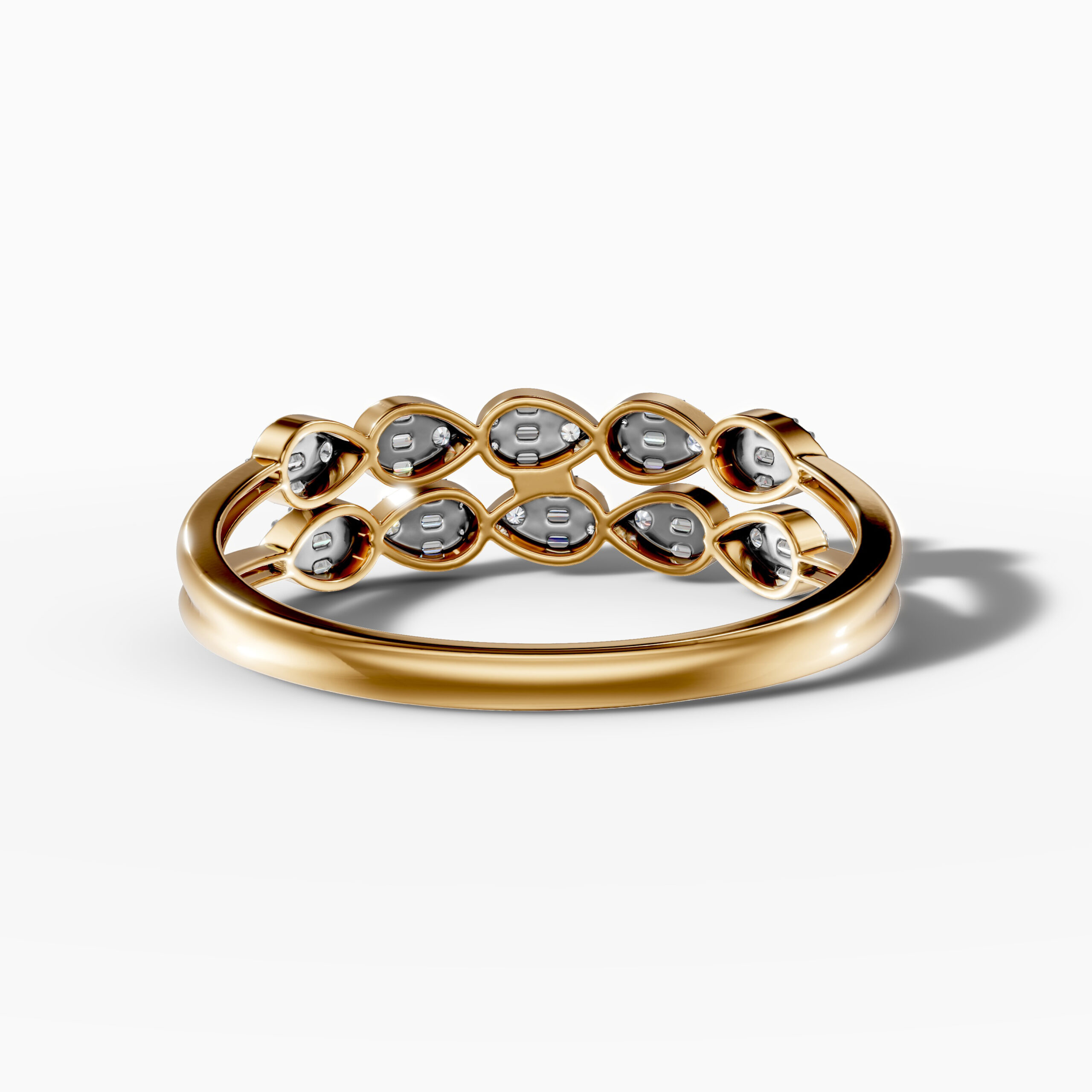A seamless blend of brilliance and balance. This Aminov Jewelry ring in 14K yellow gold features two rows of pear-shaped motifs, each delicately set with baguette and round-cut natural diamonds. The alternating shapes create a refined rhythm of light and texture, adding depth and modern sophistication to the piece.