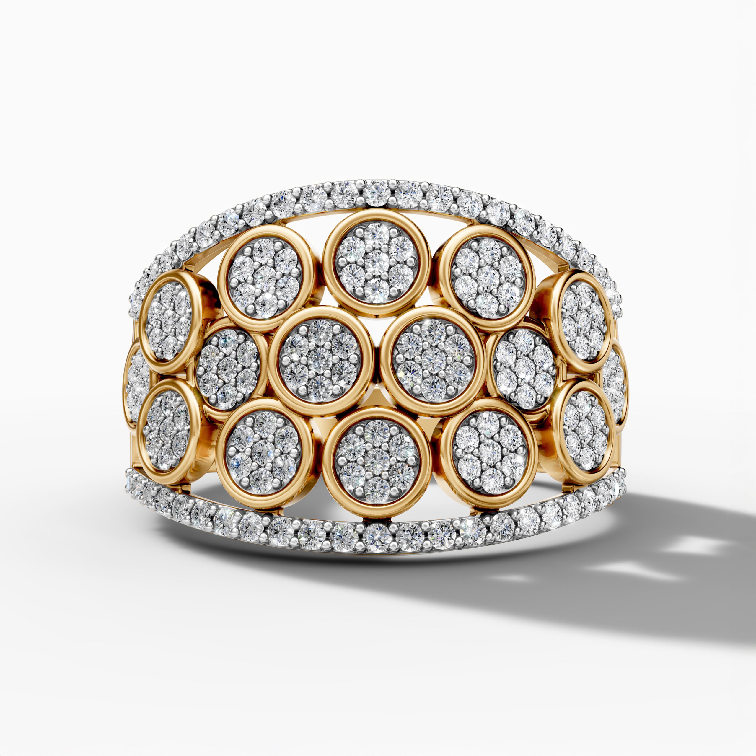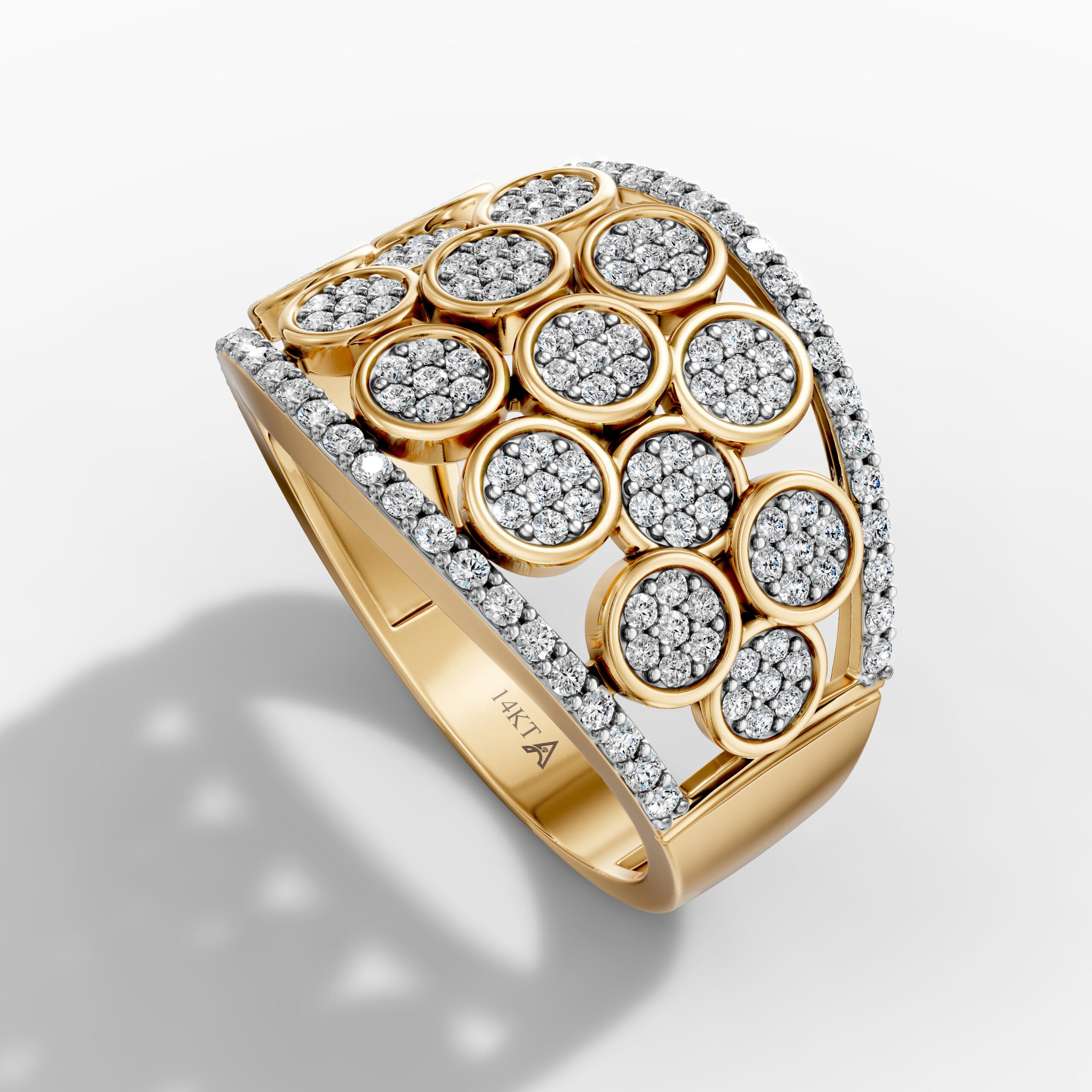 Crafted in 14K yellow gold, this ring showcases an intricate arrangement of circular pavé-set natural diamonds framed by a halo of brilliant stones. Each round motif catches light from every angle, forming a sculptural pattern that feels both playful and luxurious.