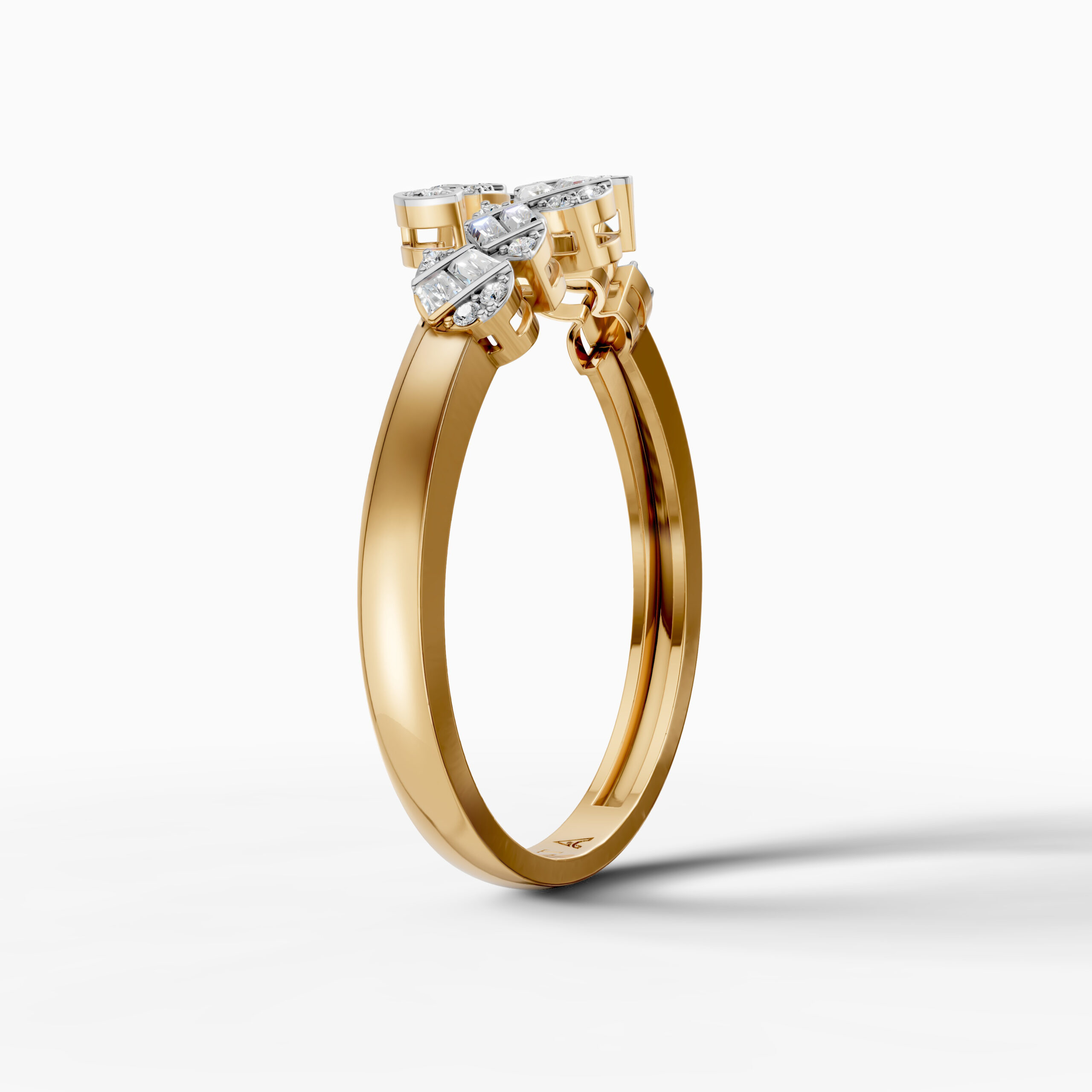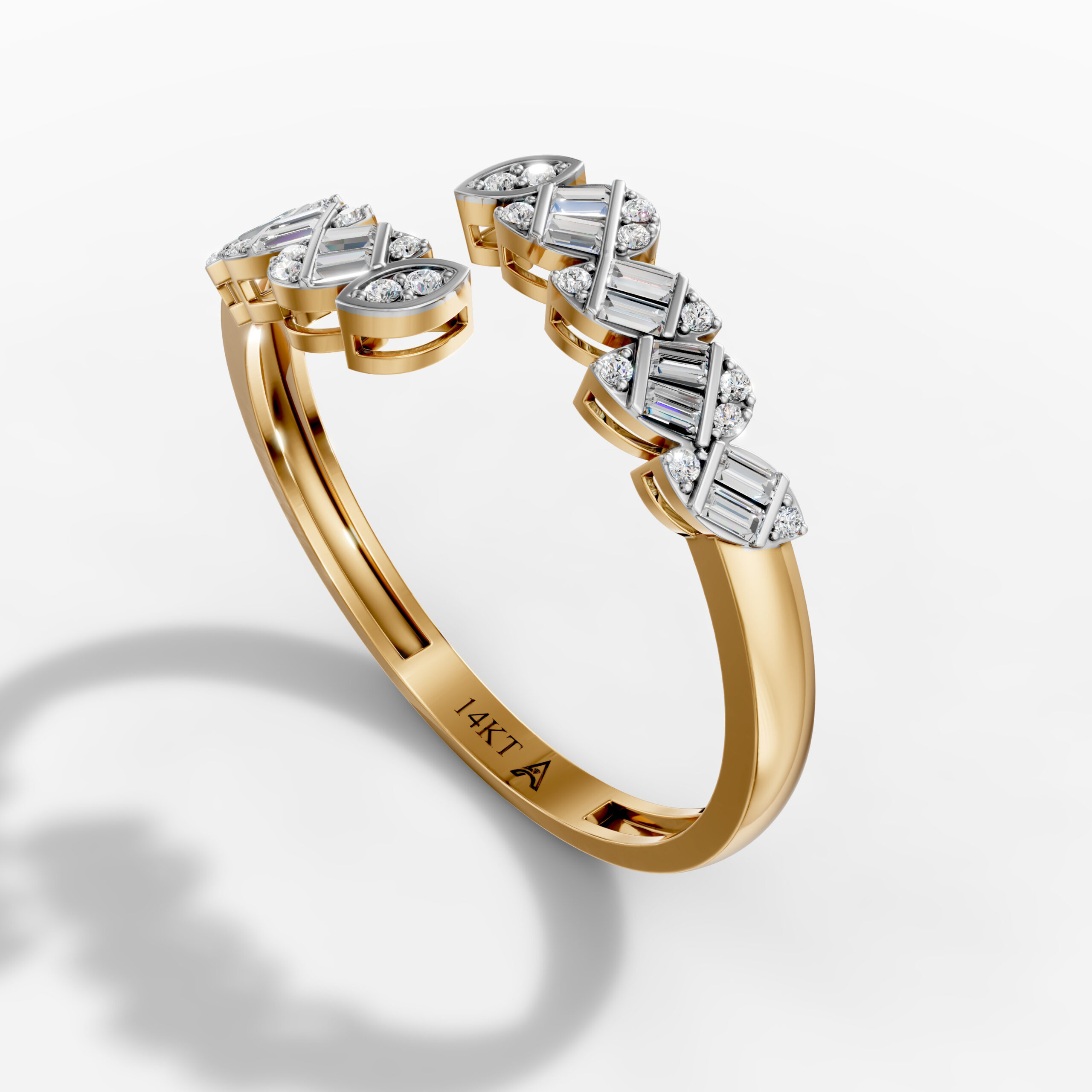 Crafted in 14K yellow gold, it features an open-band silhouette adorned with baguette and round-cut natural diamonds, arranged in graceful leaf motifs on both ends. The negative space enhances its light, contemporary feel, while the intricate detailing reflects timeless craftsmanship.