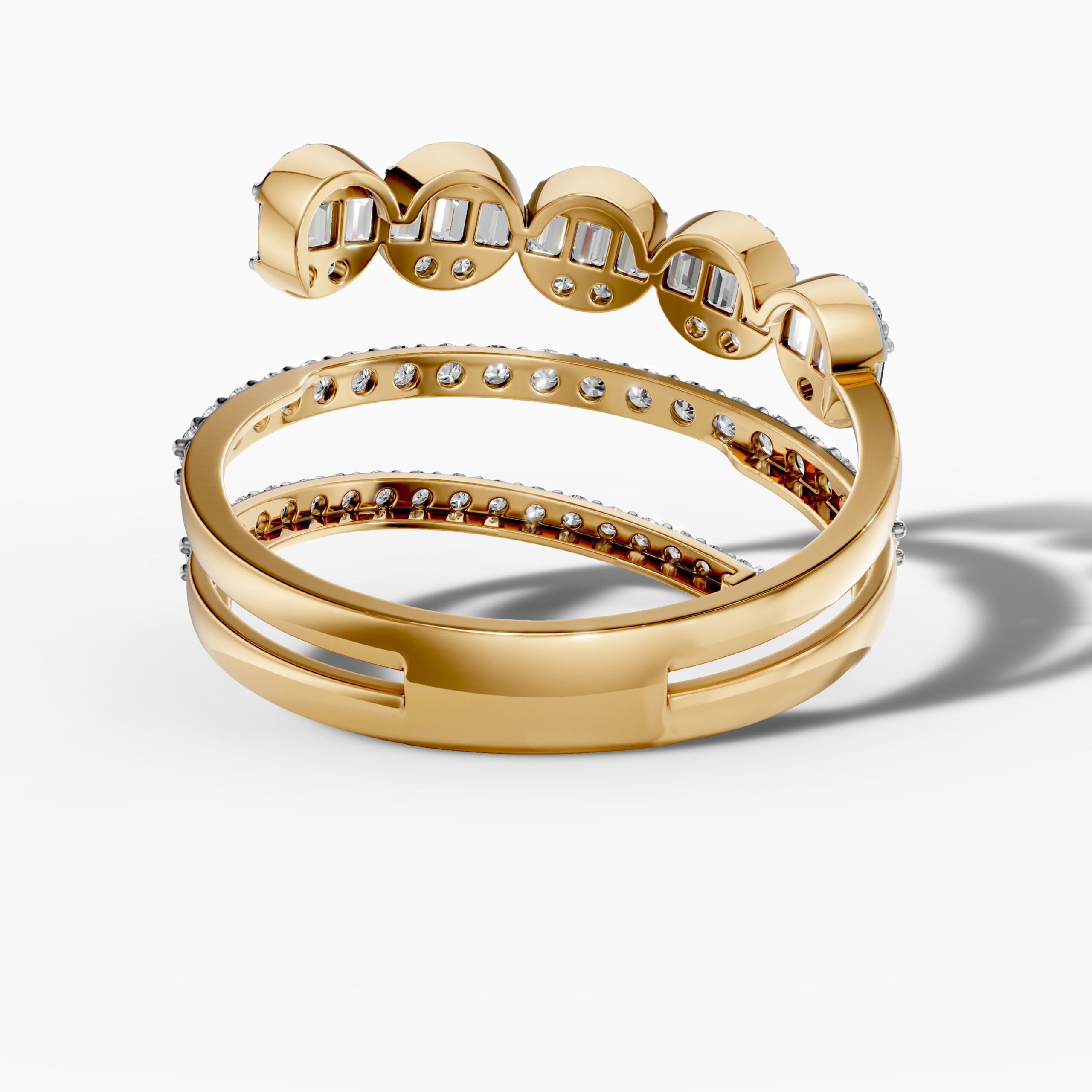 Looking for a modern diamond ring that blends sophistication and artistry? Handcrafted by Aminov Jewelry in Miami, this 14K yellow gold open band design features alternating rows of baguette and round-cut natural diamonds. The airy silhouette wraps around the finger with balance and brilliance, making it the perfect piece for those who love understated luxury.